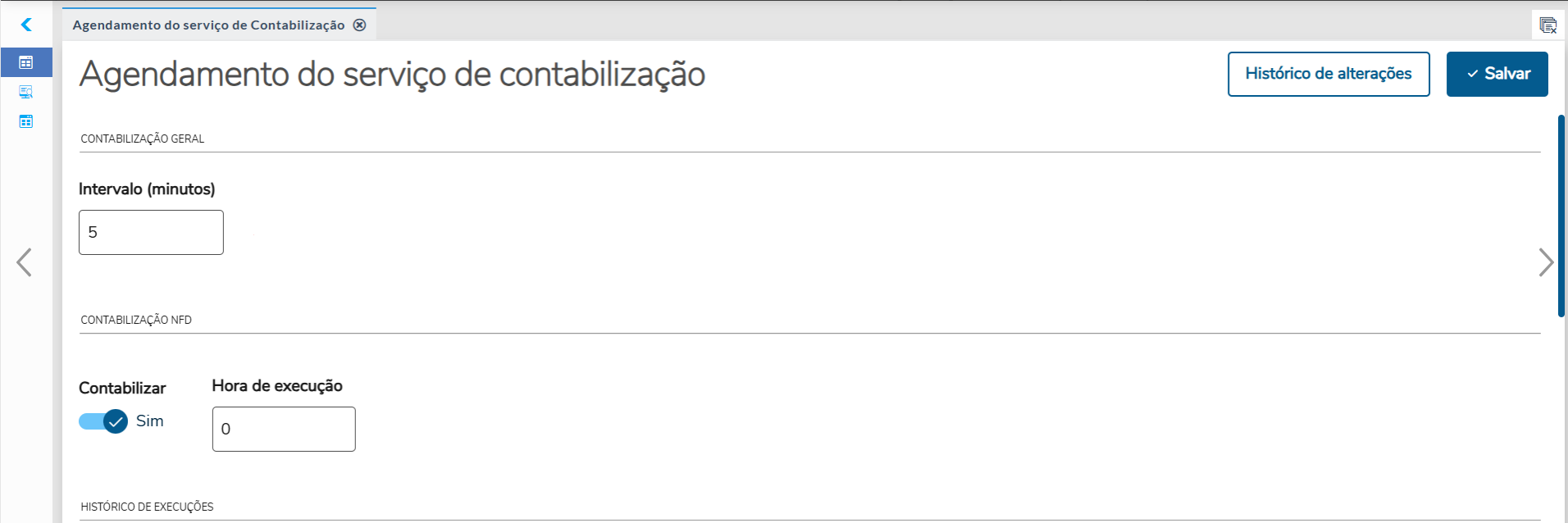 Foi disponibilizada a aplicação Agendamento do serviço de contabilização - ABAM_00021 para o usuário poder definir o intervalo de execução da contabilização. Também é possível definir separadamente se será executado o processo de contabilização da NFD e o horário de execução.
