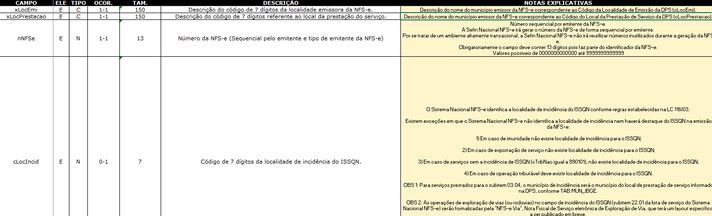 Alguns municípios, podem orientar formas de detalhar as informações, como em informações complementares ou descrição do serviço, mas é importante reforçar que as informações irão para o ambiente nacional, conforme leiaute disponibilizado, não abrangendo desdobramentos de itens ou local de operação.