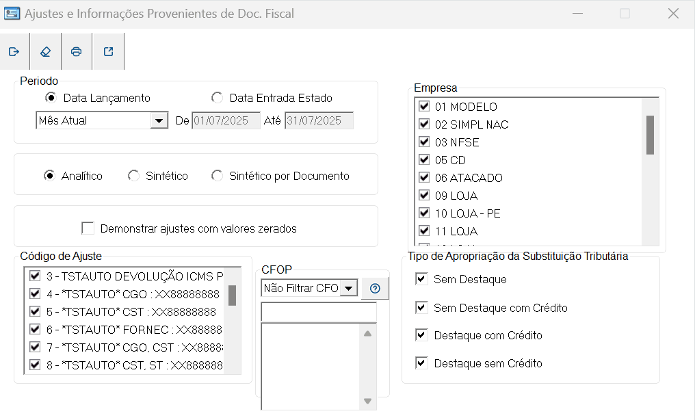 Por padrão, o filtro traz os CFOPs do período selecionado para todas as empresas, o que pode aumentar o tempo de carregamento da aplicação, causando lentidão na abertura.