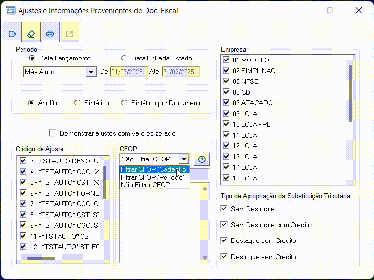 Ao abrir a tela, o usuário pode selecionar o tipo de filtragem desejado, e o sistema ajustará automaticamente a consulta de CFOPs com base na opção escolhida. Também foi adicionada a possibilidade de digitar manualmente os códigos e um menu de seleção rápida, que permite marcar ou desmarcar todas as opções de CFOP de forma prática.
