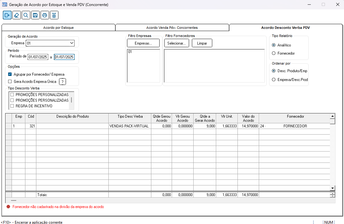 | Caminho: | Acordos e Verbas > Administração > Geração de Acordo por Estoque e Venda PDV (Concorrente) |