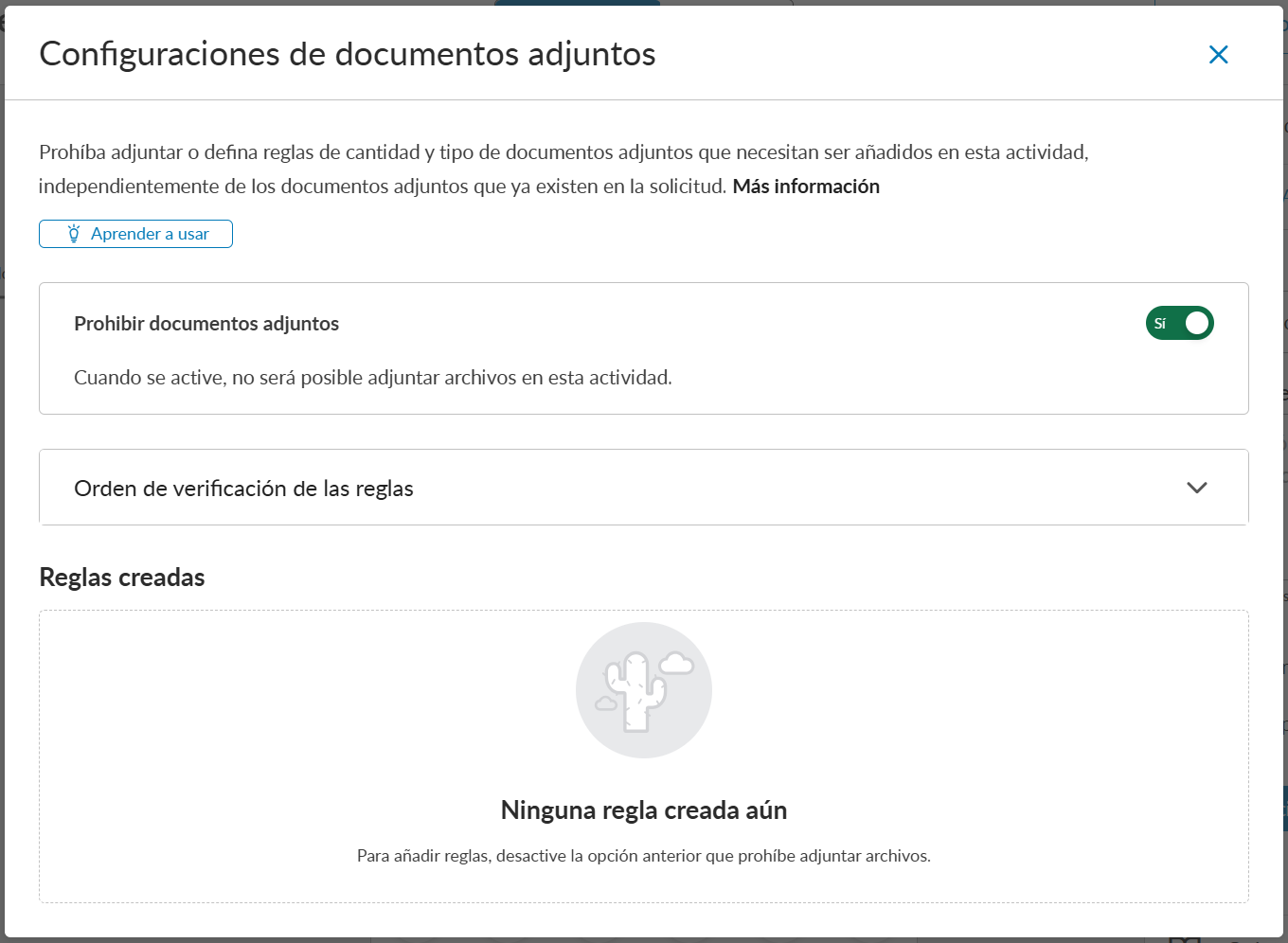 Si no se define ninguna regla, se permite agregar cualquier tipo y cualquier cantidad de archivos adjuntos, es decir, no se realiza ninguna validación.