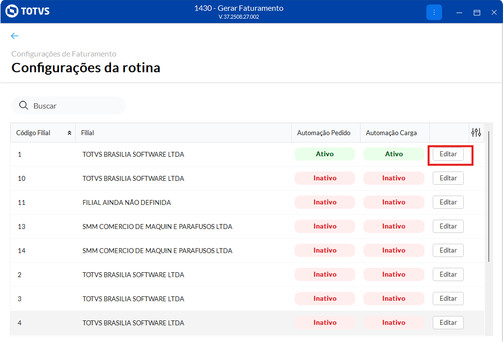 Essa configuração é válida apenas para a filial em que foi definida.