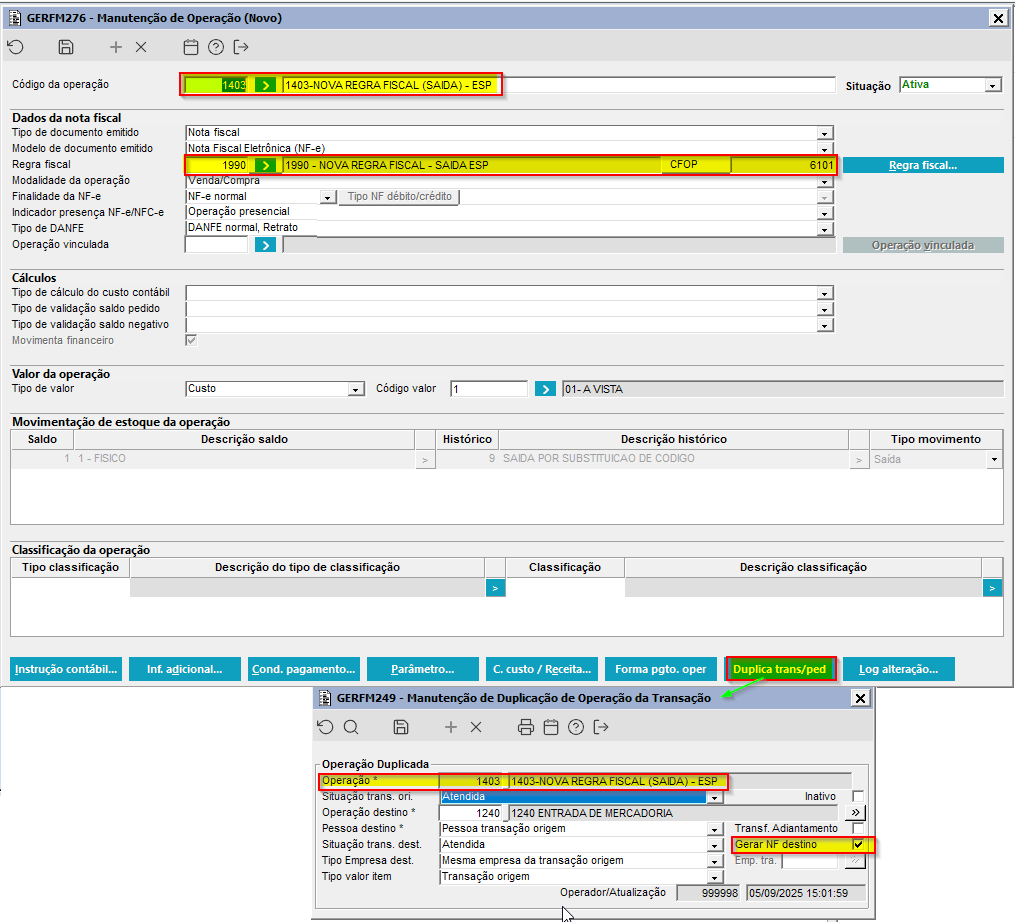 - O usuário deverá configurar em uma operação de venda no GERFM276 teclando o botão de "Duplica trans/ped" para abrir o GERFM249 e implementar as seguinte informações: