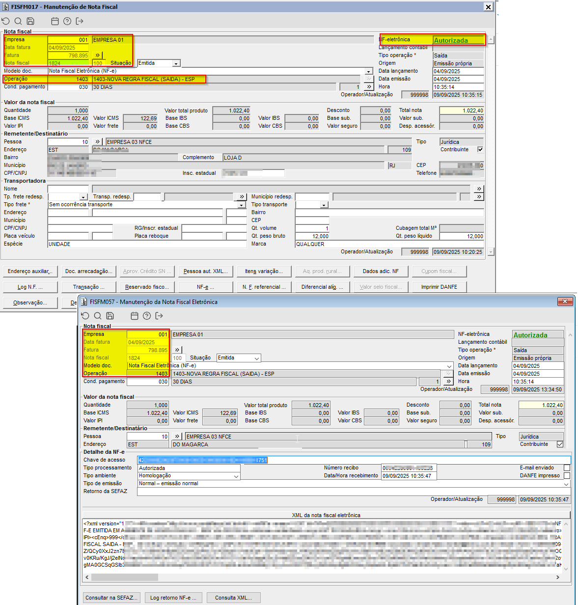 Imagem 03 - Demonstração no FISFM017 – Manutenção de Nota Fiscal. Realizada a consulta, no FISFM017, da NF-e de saída gerada sob o número 1824/100, vinculada à fatura 798.895, na empresa 001 e mostrando o XML gerado.