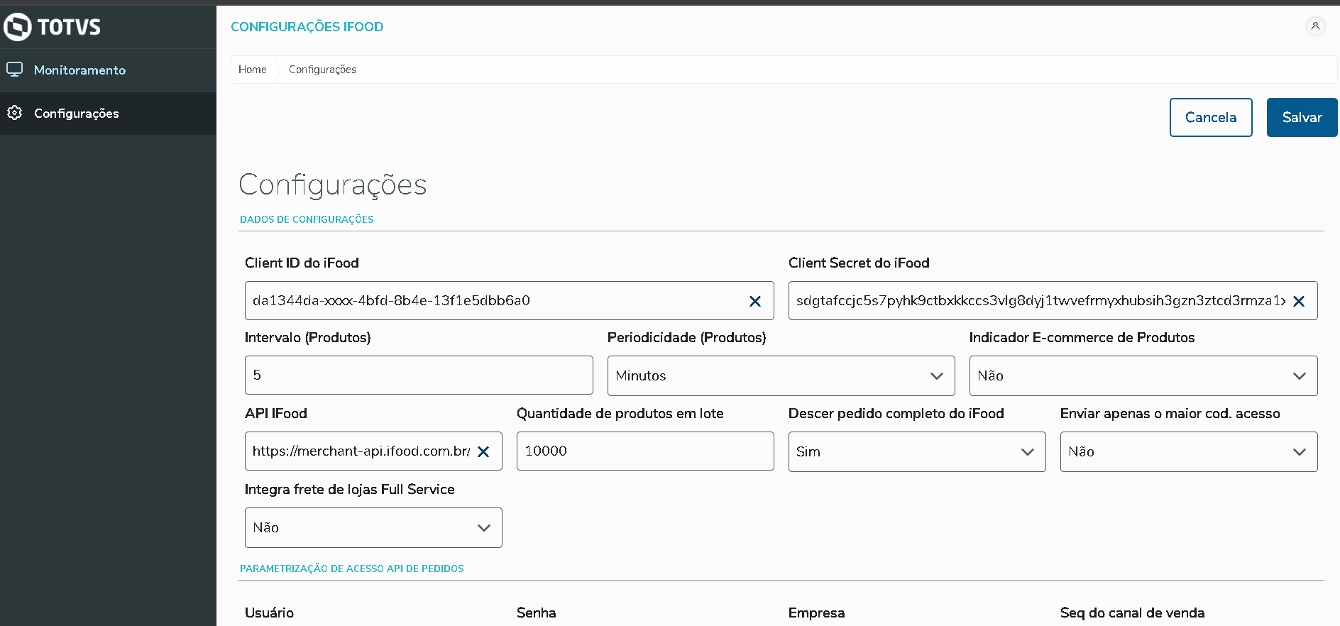 | Função: | CONFIGURAÇÕES CONECTOR IFOOD - INTIFOOD03 |