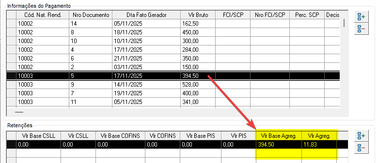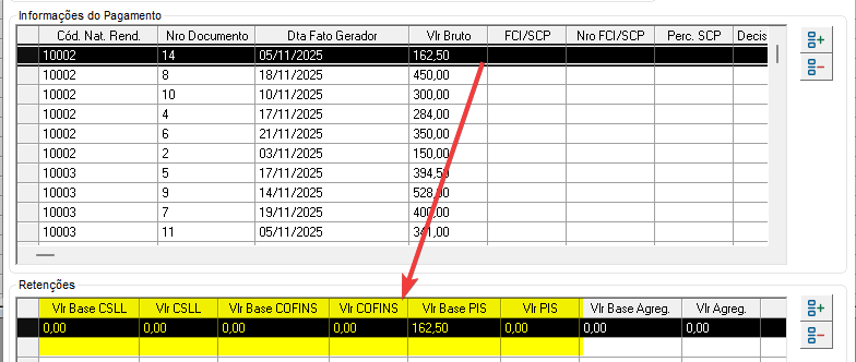 Quando for utilizada uma natureza de despesa que gera agrupamento para PIS/COFINS/CSLL, se no título for informada base de apenas um dos impostos, essa base não será considerada. Isso ocorre porque, segundo a regra de geração de valor agregado, todos os três impostos devem possuir valor de base mínimo para que o agrupamento seja realizado.