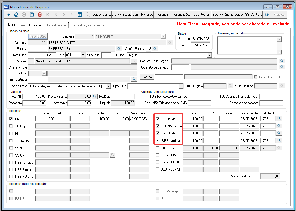 Para que os valores sejam considerados no REINF, ao escriturar o documento é necessário marcar o checkbox correspondente a cada imposto independentemente de haver valores informados sempre que o usuário precisar que esses tributos sejam enviados ao REINF. Caso não sejam marcados, os valores não serão incluídos na geração do REINF, conforme o exemplo abaixo.
