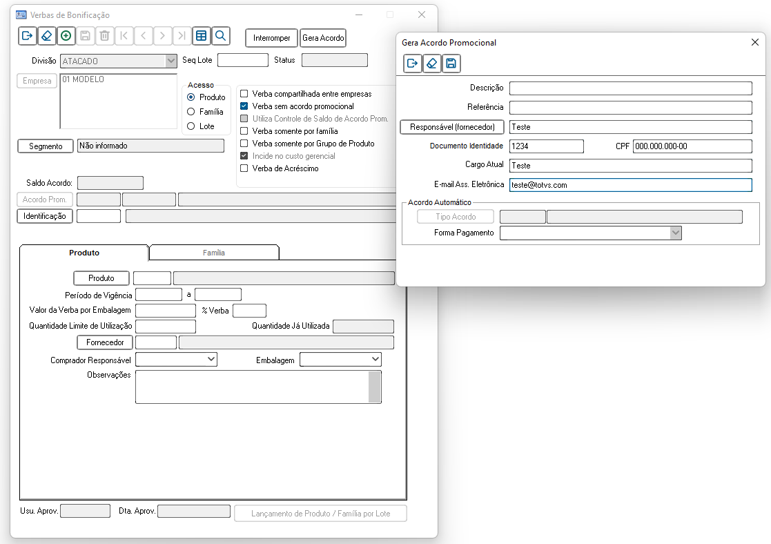 Crie uma Verba Sem Acordo Promocional preenchendo na dialog de Gera Acordo Promocional os dados de um Responsável (Nome, Documento, CPF e Cargo).
