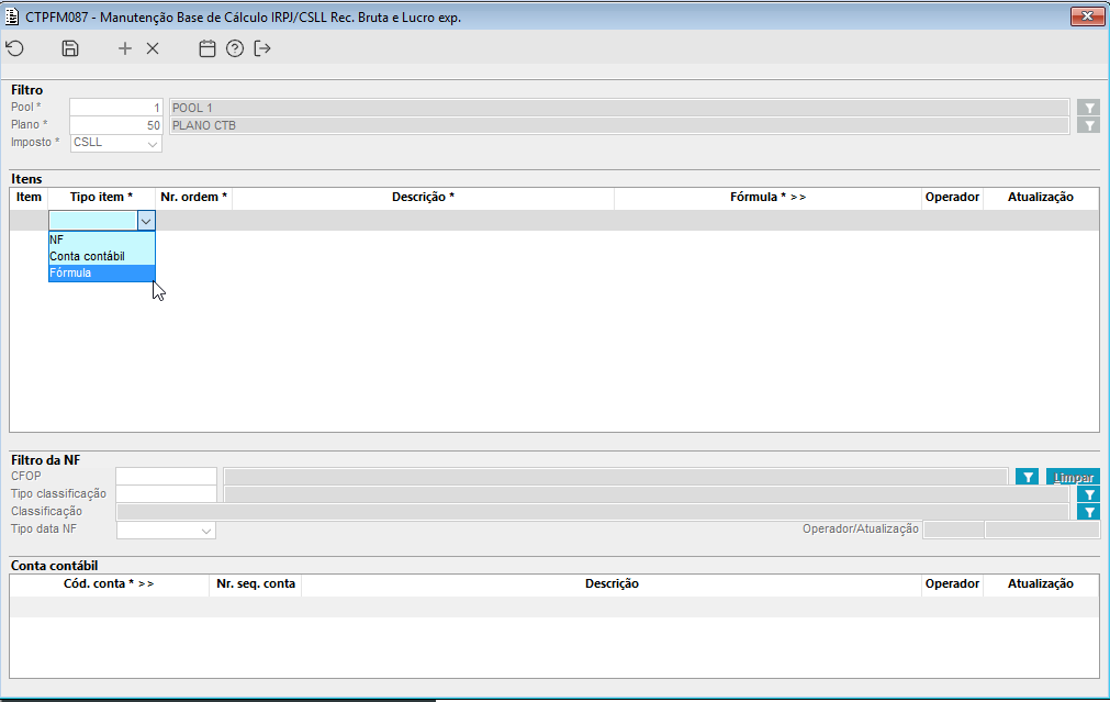 Imagem 2.2 - Demonstração dos tipos de configuração existentes (NF, Conta contábil e Fórmula) antes da alteração.