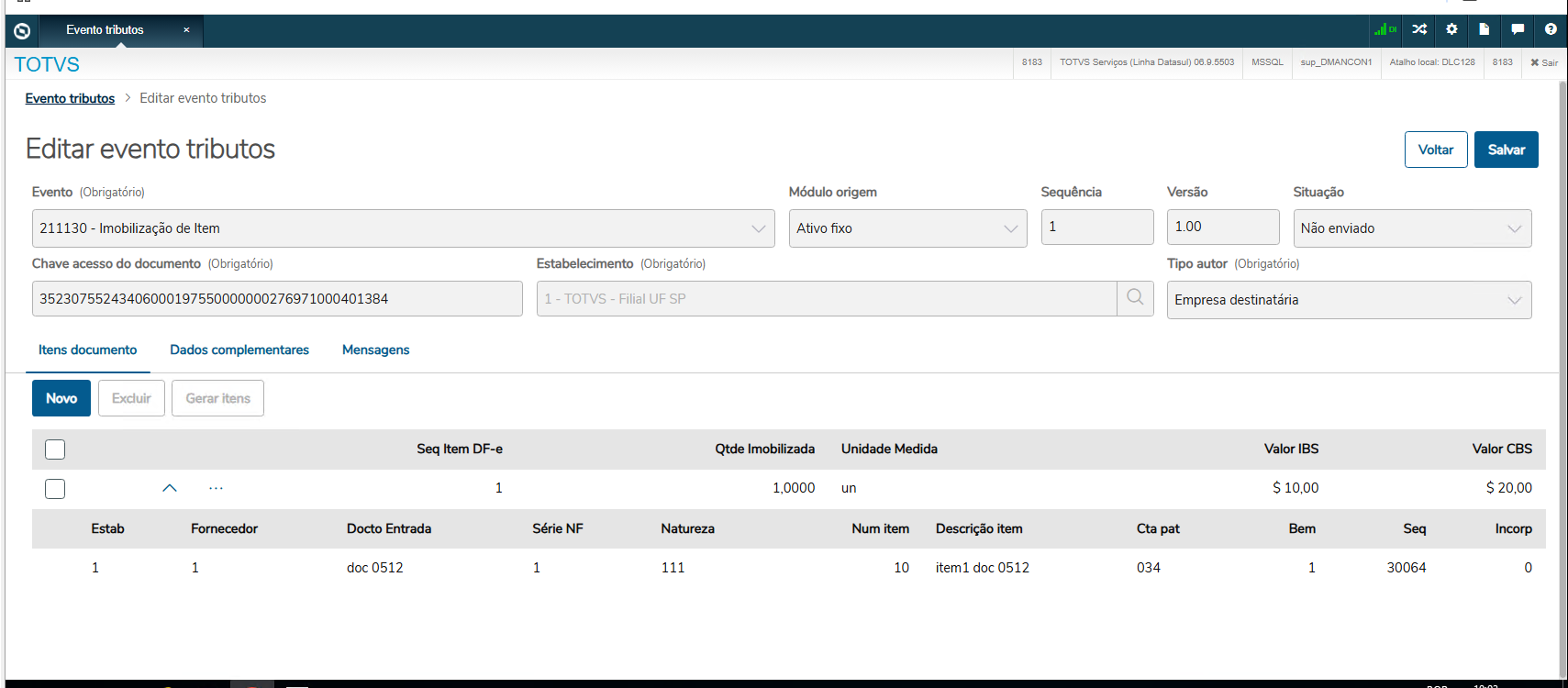 - Gera Evento Imob. Item: Esse campo indica se deve ser gerado o evento de Imobilização (211130) do item no documento de entrada da Reforma Tributária. Esse evento é obrigatório para o adquirente quando o bem for incorporado ao ativo imobilizado, permitindo à administração tributária controlar o prazo para pedidos de ressarcimento de crédito, conforme o art. 40, I, da LC nº 214/2025.