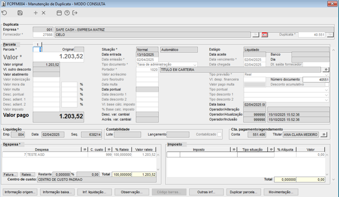Imagem 5 - Detalhamento da duplicata referente à despesa de antecipação.