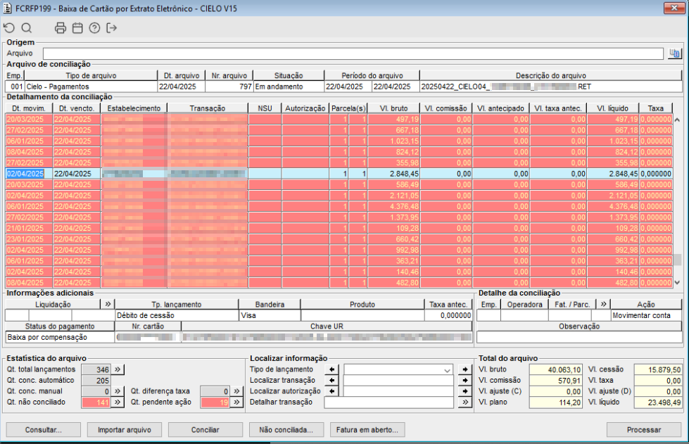 Imagem 3 - Detalhamento do primeiro arquivo de negociação lido após a configuração do parâmetro. Nesse arquivo, nenhuma venda será baixada, apenas ocorrerá a movimentação da conta banco com o saldo das antecipações e a geração da duplicata referente à taxa de antecipação. O tipo de lançamento utilizado é o 98 - Créditos de antecipação. Todos os lançamentos já possuirão a ação "Movimentar conta".