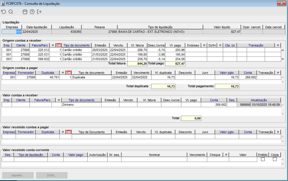 Imagem 4 - Detalhamento da liquidação gerada 228 - Baixa de cartão - Negociação com o vinculo da duplicata e do movimento gerado na conta banco.