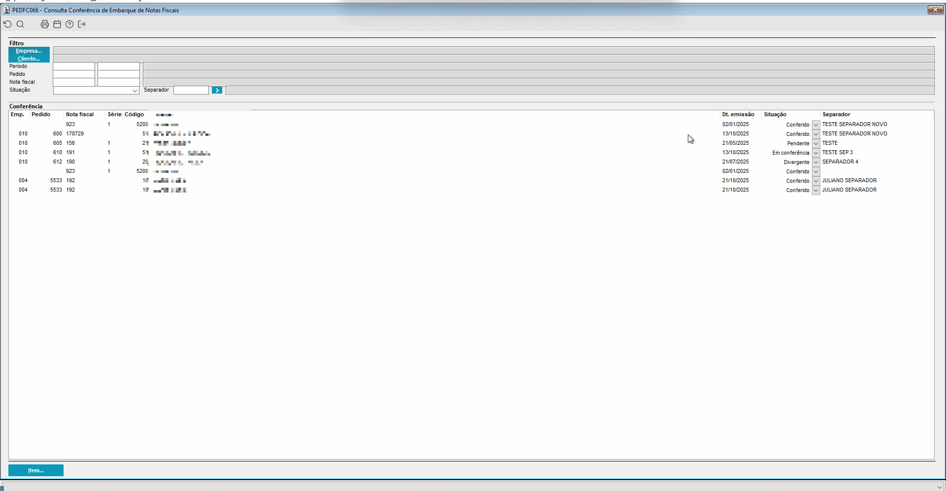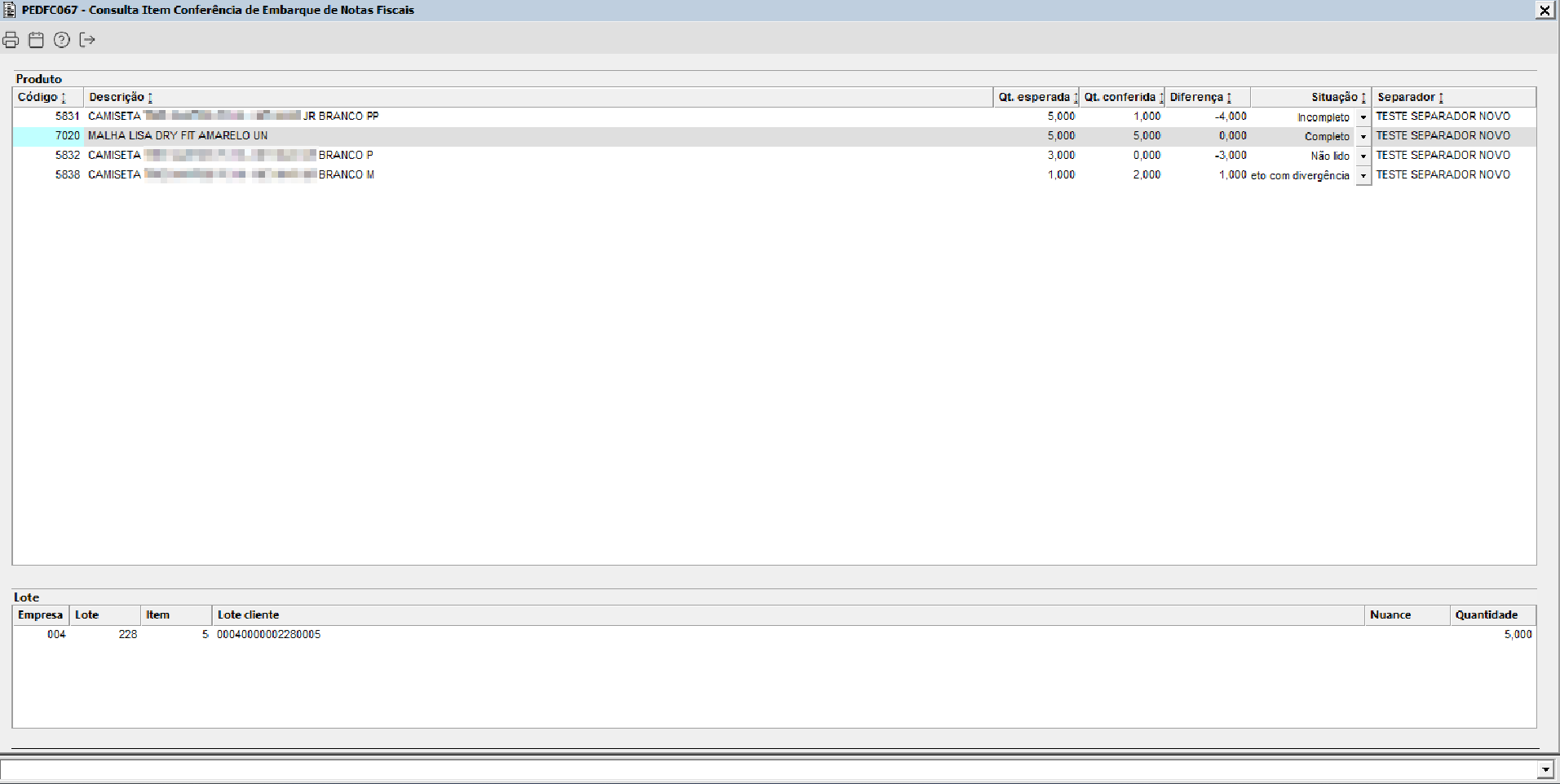 É possível visualizar os itens da conferência de embarque selecionando uma das linhas e clicando no botão “Item”. Ao realizar essa ação, serão exibidos os itens correspondentes, juntamente com suas quantidades e situações. Além disso, na parte inferior da tela serão apresentadas as informações do lote vinculado a cada item, quando houver vínculo existente.