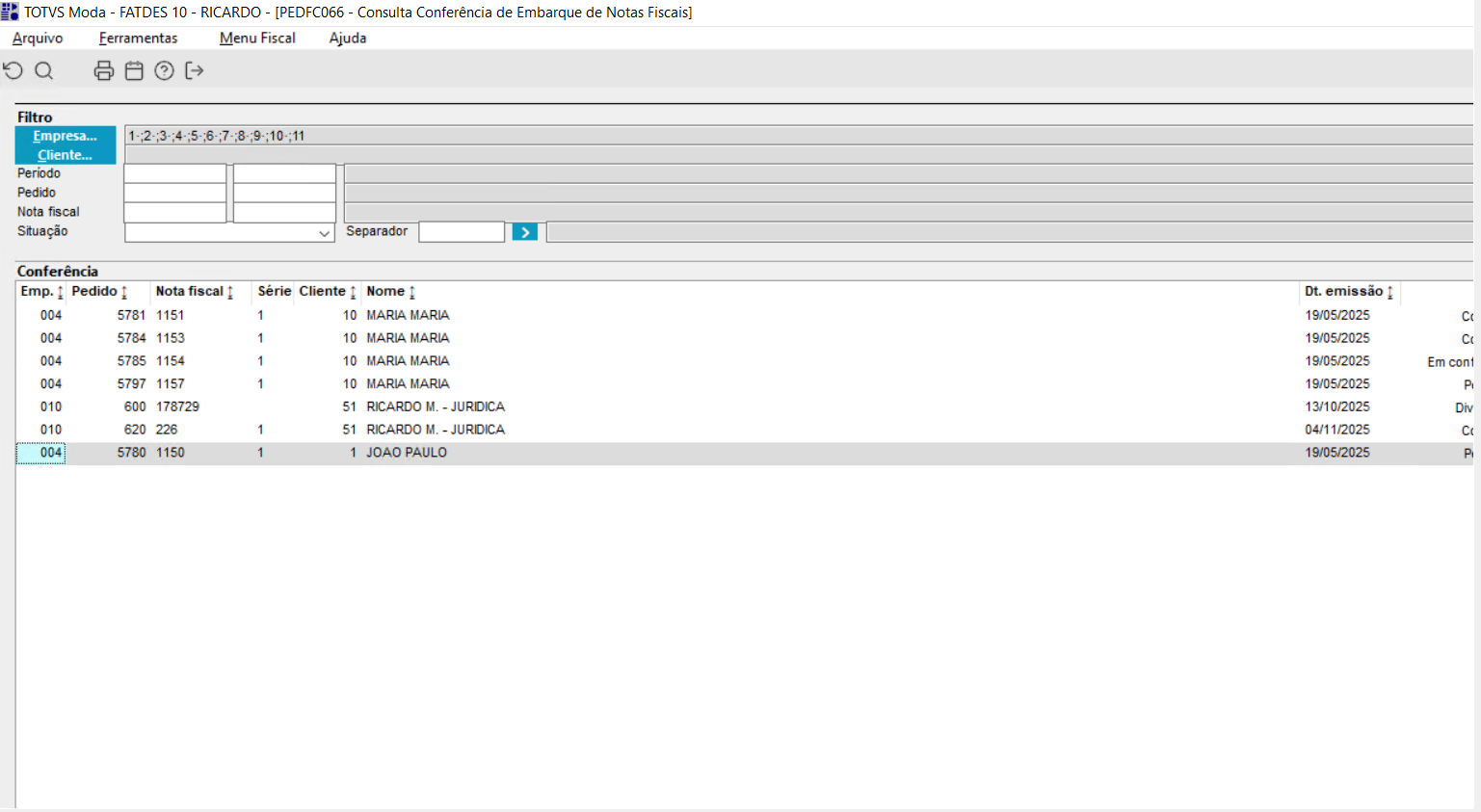 | Função: | Tela de Consulta das Conferências de Notas Fiscais PEDFC066 e PEDFC067 |