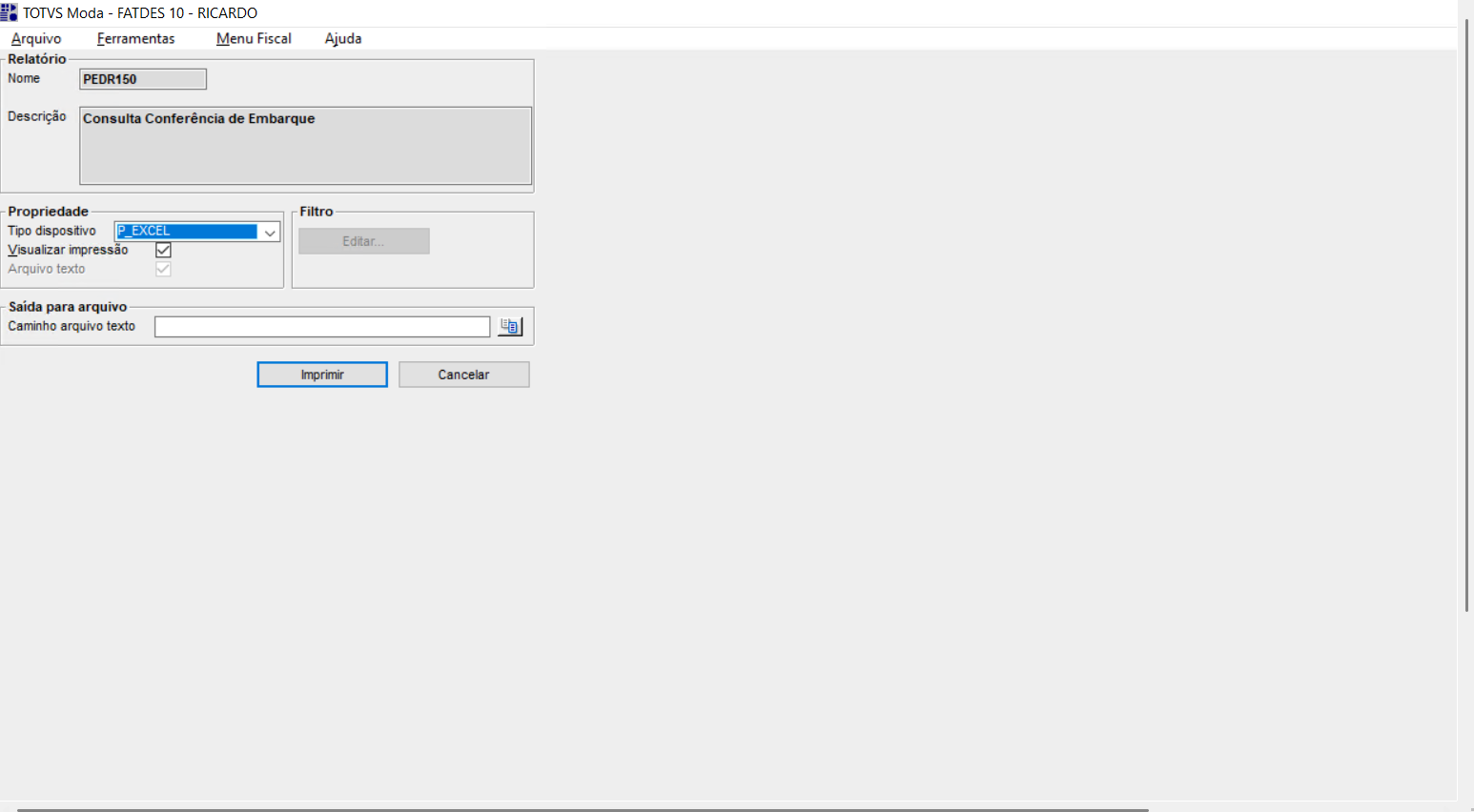 Após clicar no botão de impressão, será exibida uma outra tela, onde o usuário poderá inserir dados do relatório a ser impresso e o tipo (Excel ou PDF).