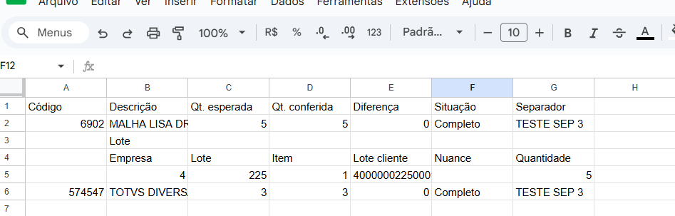 Caso o usuário escolha o tipo .CSV, este será o layout que deverá abrir no Excel: