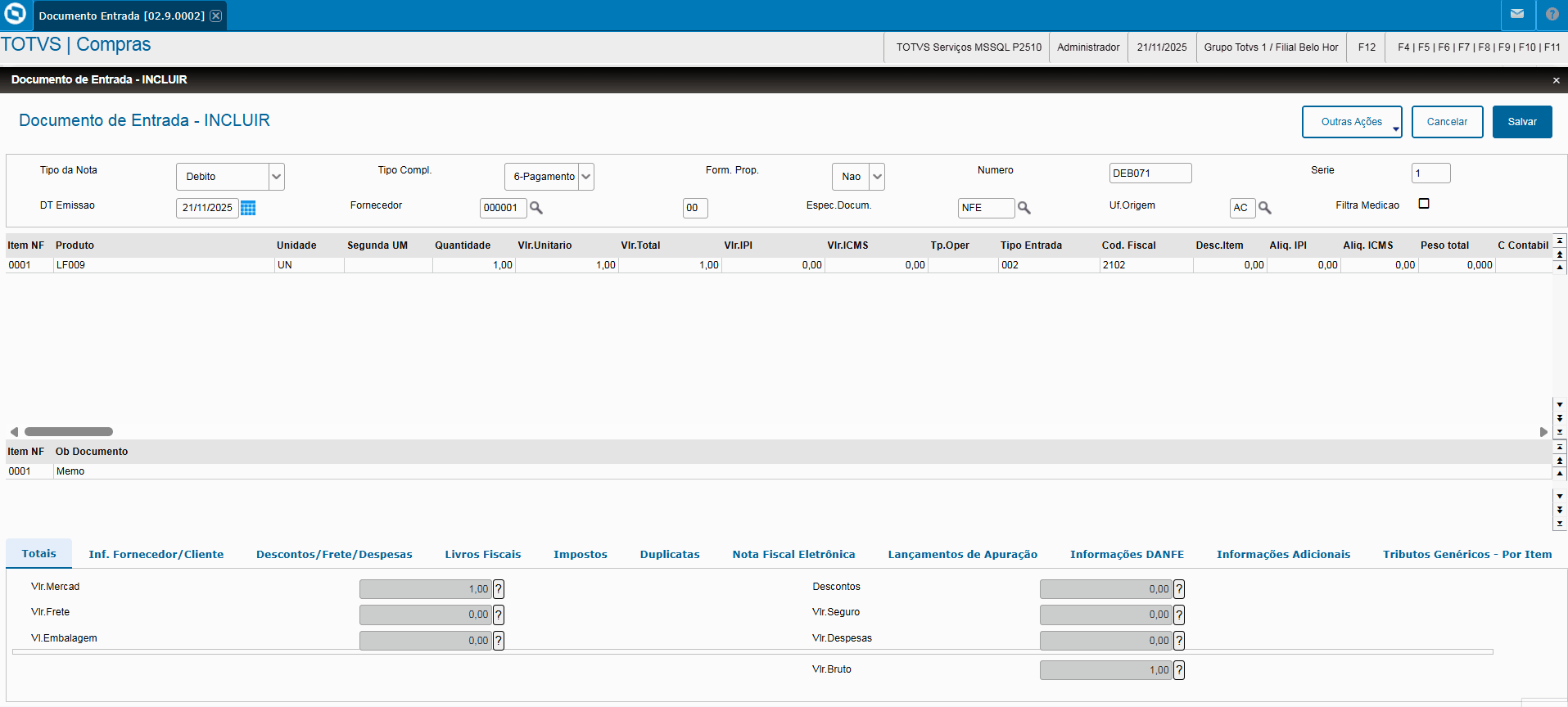 Quando o vínculo for por item, e for Nota de Débito (6), com complemento de Multa e Juros (4), posicione-se no item desejado e realize a busca da referência, conforme demonstrado no exemplo em GIF abaixo. Os documentos serão buscados na tabela SF1 - Documento de Entrada.