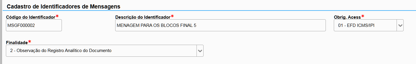 Agora, vamos cadastrar dois identificadores para a mensagem criada anteriormente: um para o código de mensagem gerado no registro de final 0 e outro para os registros de final 5 do SPED Fiscal, como exemplificado pelos registros C190 e C195.