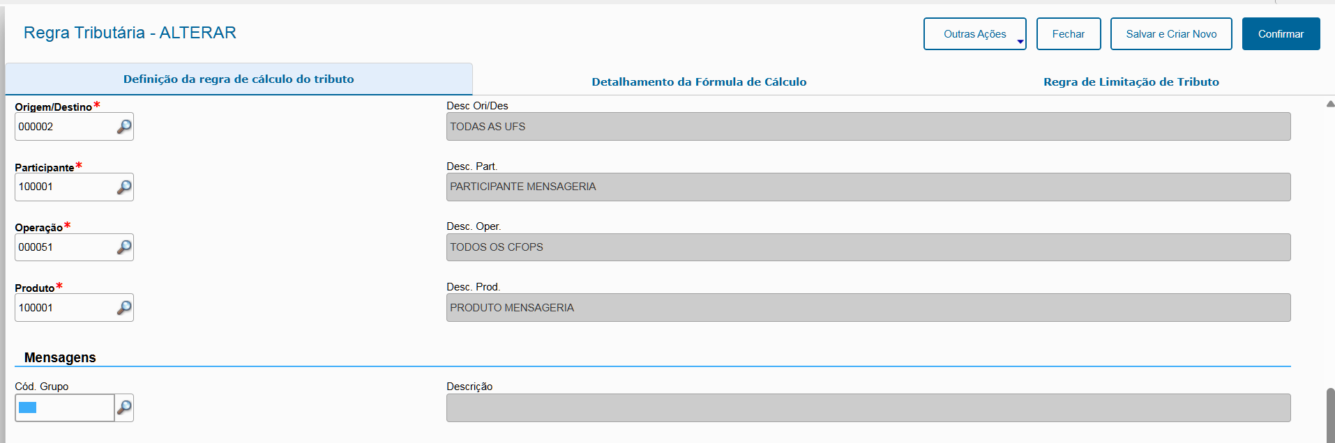 Após realizar os cadastros necessários e vincular as mensagens ao grupo de mensagens, vamos associar o grupo de mensagens à regra de cálculo mencionada no início desta demonstração.