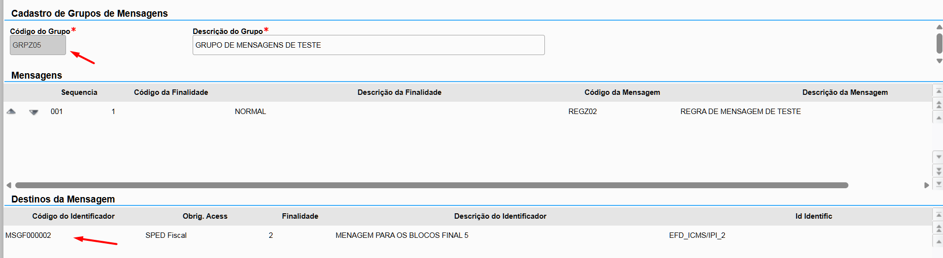 Observe que, nos campos Código da Mensagem e Código do Identificador, informamos os registros cadastrados anteriormente. Inicialmente, vamos vincular apenas o identificador de mensagem gerado nos registros de final 0.