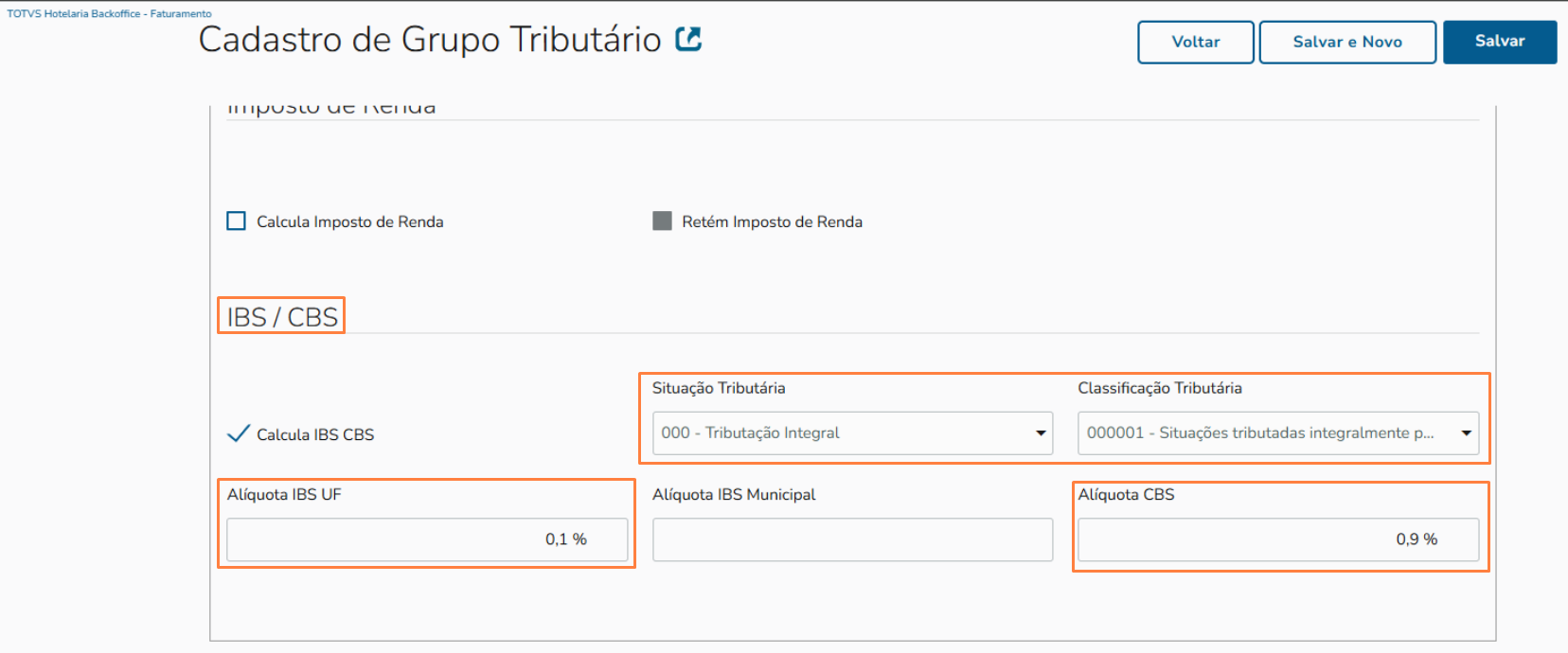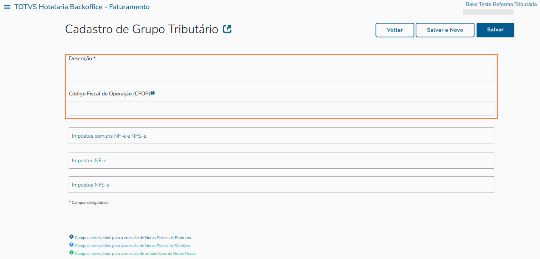 2 - Para incluir as informações dos novos campos relacionados à Reforma Tributária, preencha a Descrição e selecione o CFOP no Grupo Tributário;