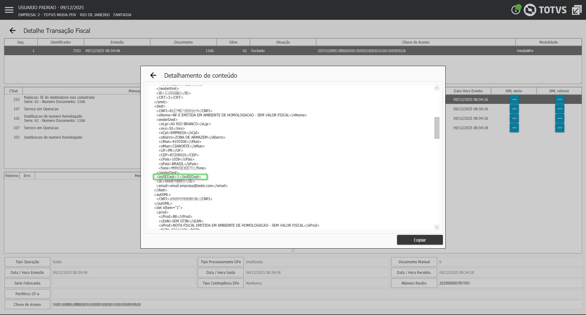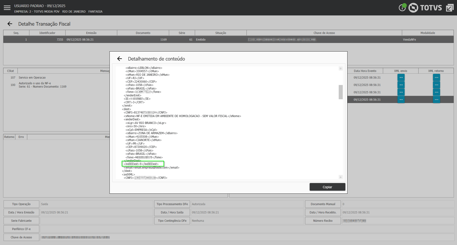 Imagem 02 - Tag indIEDest gerada como 9 em cliente sem inscrição estadual.