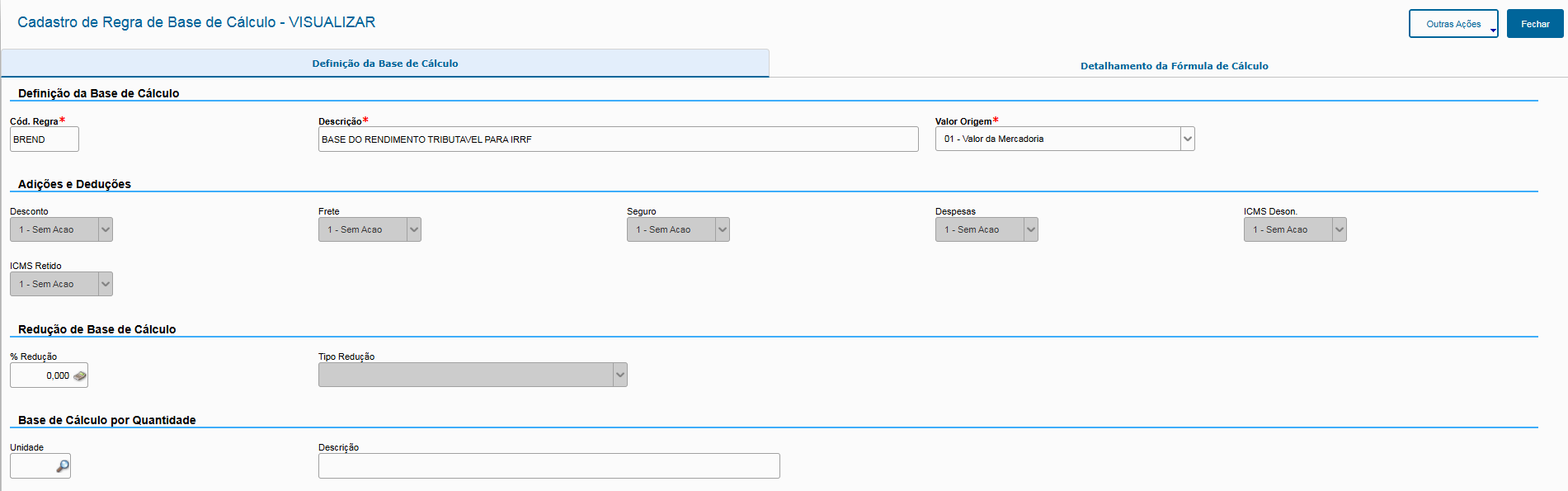 Independente de qual modelo do IRRF for escolhido (simplificado ou normal), será necessário criar uma regra de cálculo auxiliar para o valor do rendimento tributável. O valor do mesmo depende do seu cenário fiscal (redução de base, etc), nesse exemplo será utilizado o valor da mercadoria.