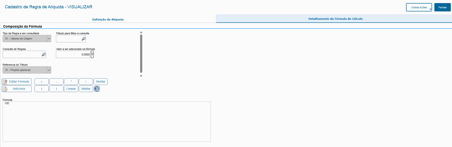 - VAL:RENDME: Valor do rendimento tributável do item do documento (nome do operando vai ser de acordo com qual o código da regra de cálculo do Rendimento Tributado que foi criada, nesse exemplo criamos ela no passo anterior como "RENDME").