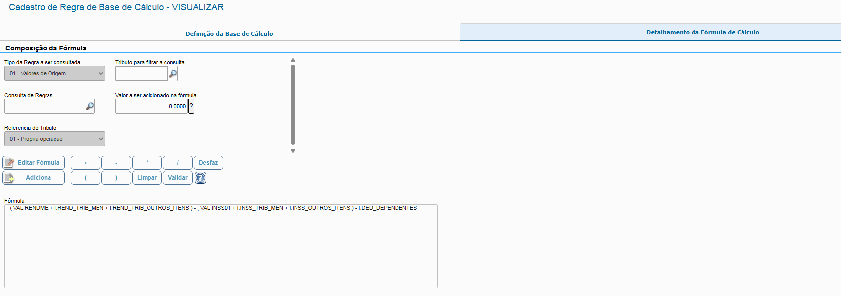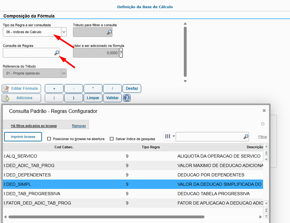 Se houver a necessidade de efetuar descontos de certos impostos na Base de Cálculo, como por exemplo descontar o INSS na Base do IRRF, isso pode ser feito durante a edição da fórmula.