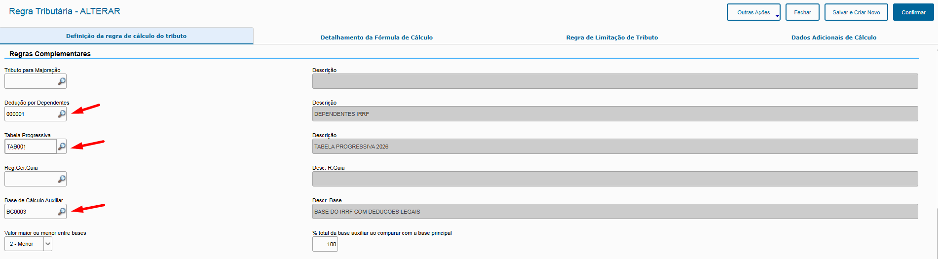 - Base de cálculo auxiliar (nesse exemplo, utilizamos a base com dedução simplificada como sendo a "principal", e a base com deduções legais como sendo a "auxiliar", assim o sistema irá calcular as duas, e verificar qual a mais vantajosa para o contribuinte).