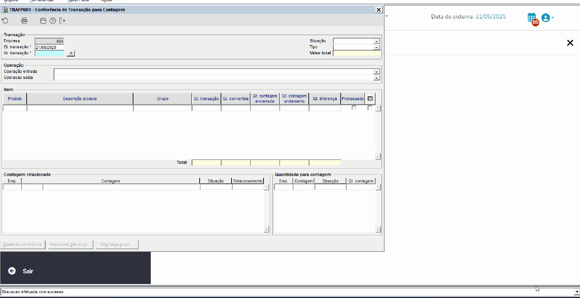 | Função: | Ajuste quantidade diferença TRAFP009 conferência de transação para contagem |
