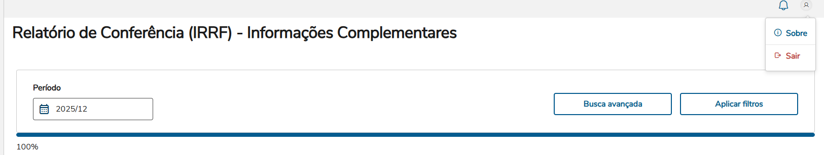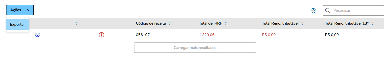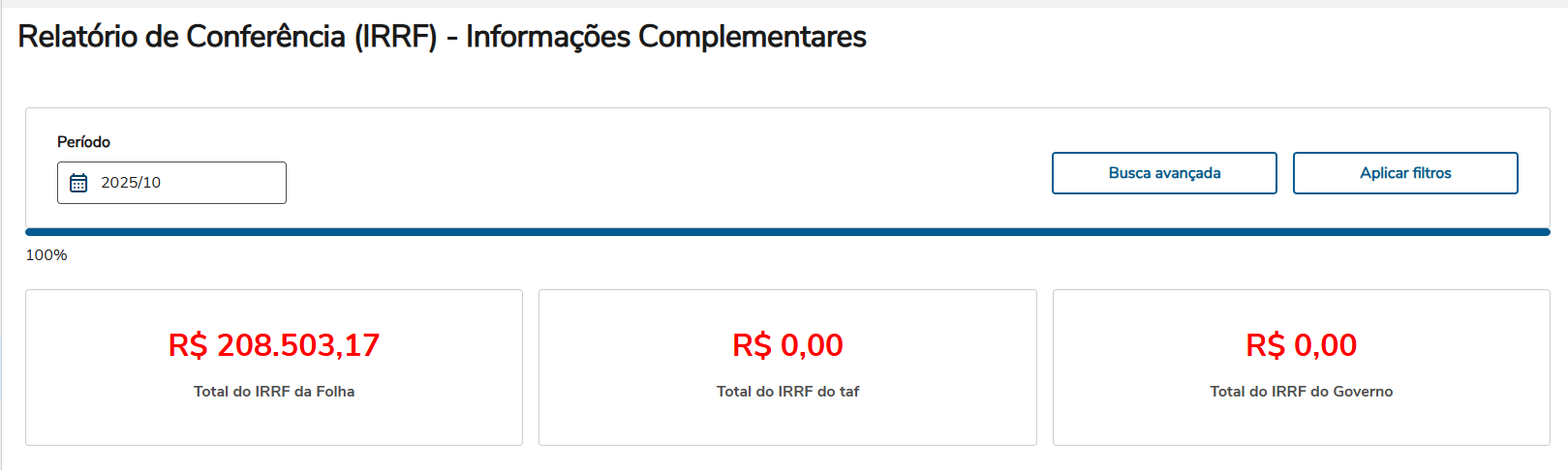 Conferência de valores IRRF | Opcional | Visão principal apresentada na tela