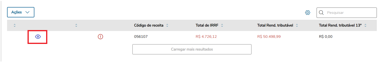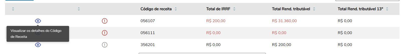 Na tela é apresentado as apurações por código de receita, temos um botão onde podemos visualizar os detalhes de cada receita e na sequência o alerta que já indica se tem divergência nos valores.