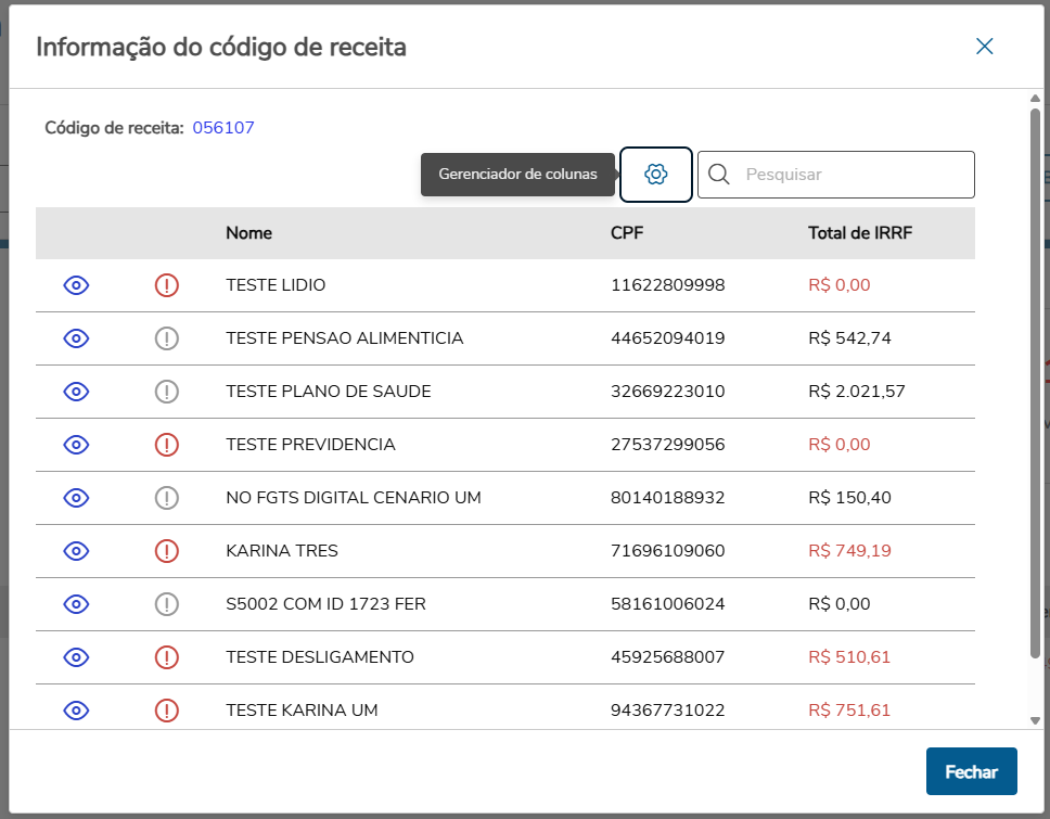 Ao selecionar um código de receita, ele abrirá uma nova tela mostrando todos colaboradores que possuem valor para receita selecionada.