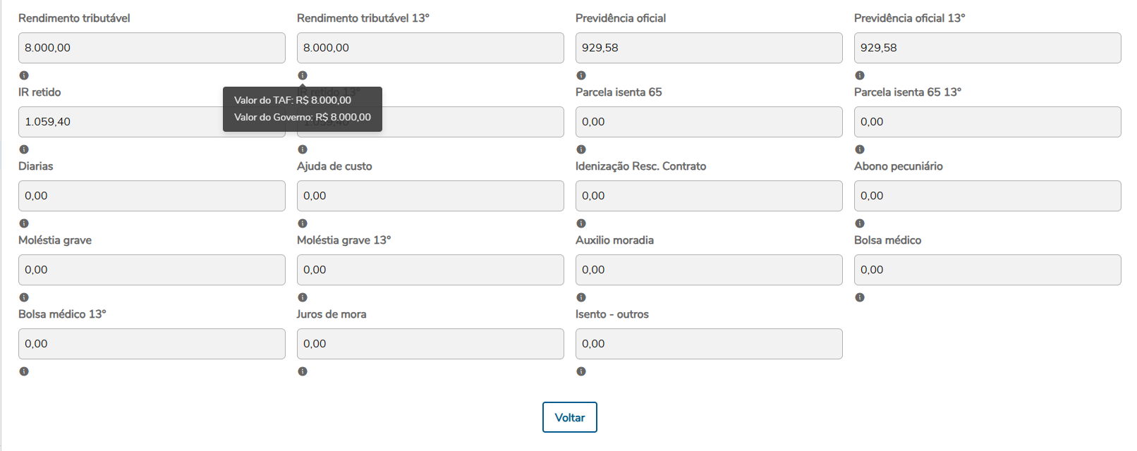 | Campos | Descrição | Valor RH | Valor TAF | Valor Governo |