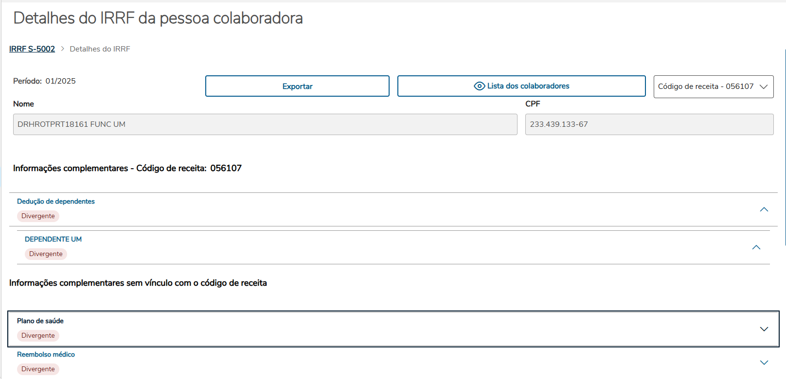 Ao clicar em um colaborador será apresentado a seguinte tela com os detalhes do IRRF: