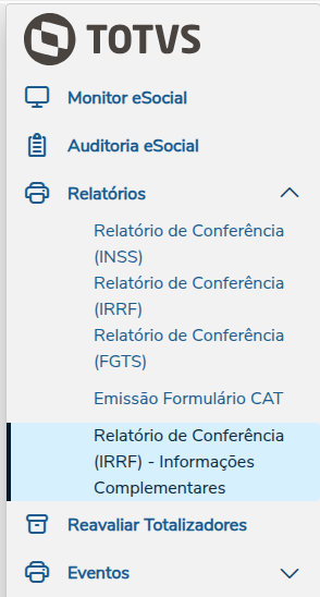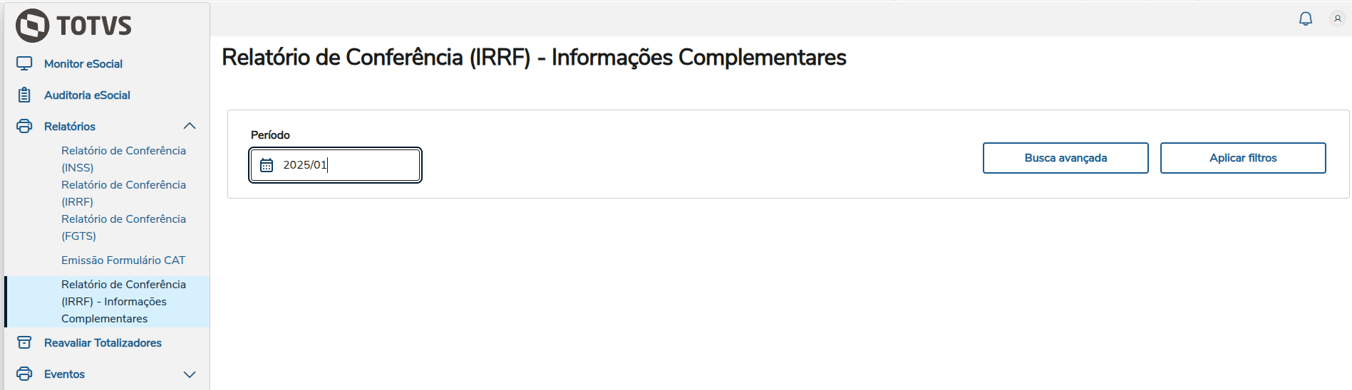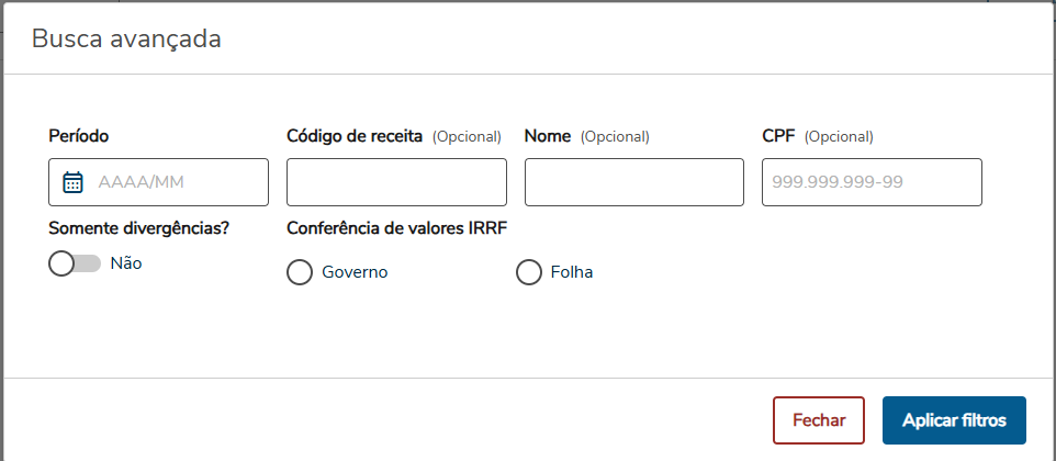 | Somente Divergências | Opcional | Parâmetro que permite listar somente os casos que apresentaram alguma divergência de valores entre as colunas RH x TAF x Governo, ou listar todos os colaboradores que possuam valor de IRRF em sua remuneração, independente de divergência ou não. Opções: