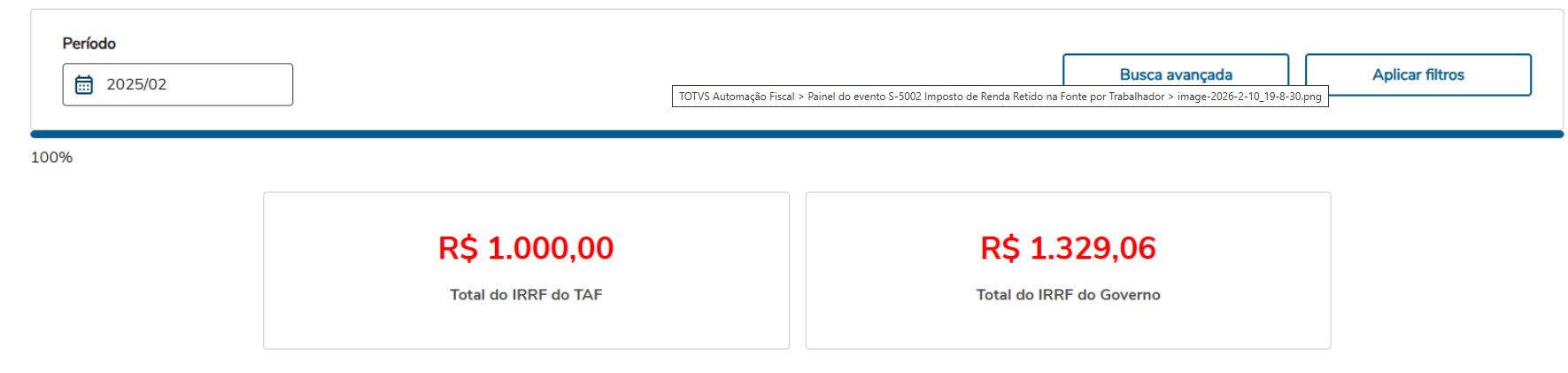Os dados apresentados são originados da comparação dos valores de IRRF integrados do ERP ( S-1200, S-2299, S-2399 e S-1210 ) contra os valores existentes nas tabelas do TAF e valores retornados do Governo pelo evento S-5002 que são apurados conforme data de pagamento das verbas.