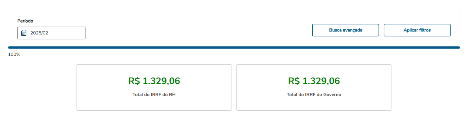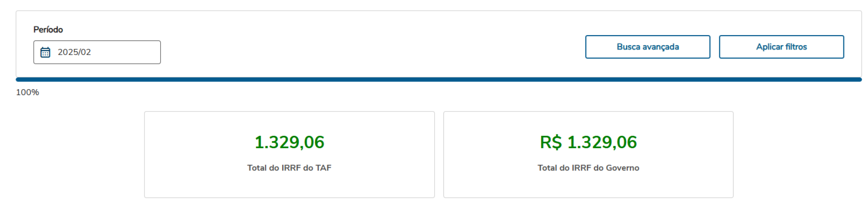 Ao final do processamento, são apresentados os valores total do IRRF e uma tabela com os valores por código de receita. Os valores apresentados em tela são o retorno do totalizador do S-5002 exceto o card Total do IRRF do TAF.