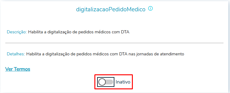 Anteriormente, o parâmetro 'digitalizacaoPedidoMedico' estava integrado à lista geral de configurações de parâmetros, sem mecanismos de alerta ou a obrigatoriedade de aceite dos Termos de Uso.