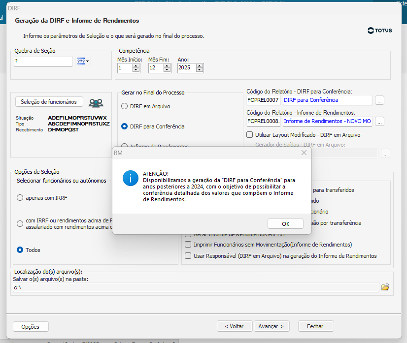 Ao marcar a opção “DIRF para Conferência”, caso o ano informado na Competência seja superior a 2024, o sistema apresentará a seguinte mensagem de alerta: