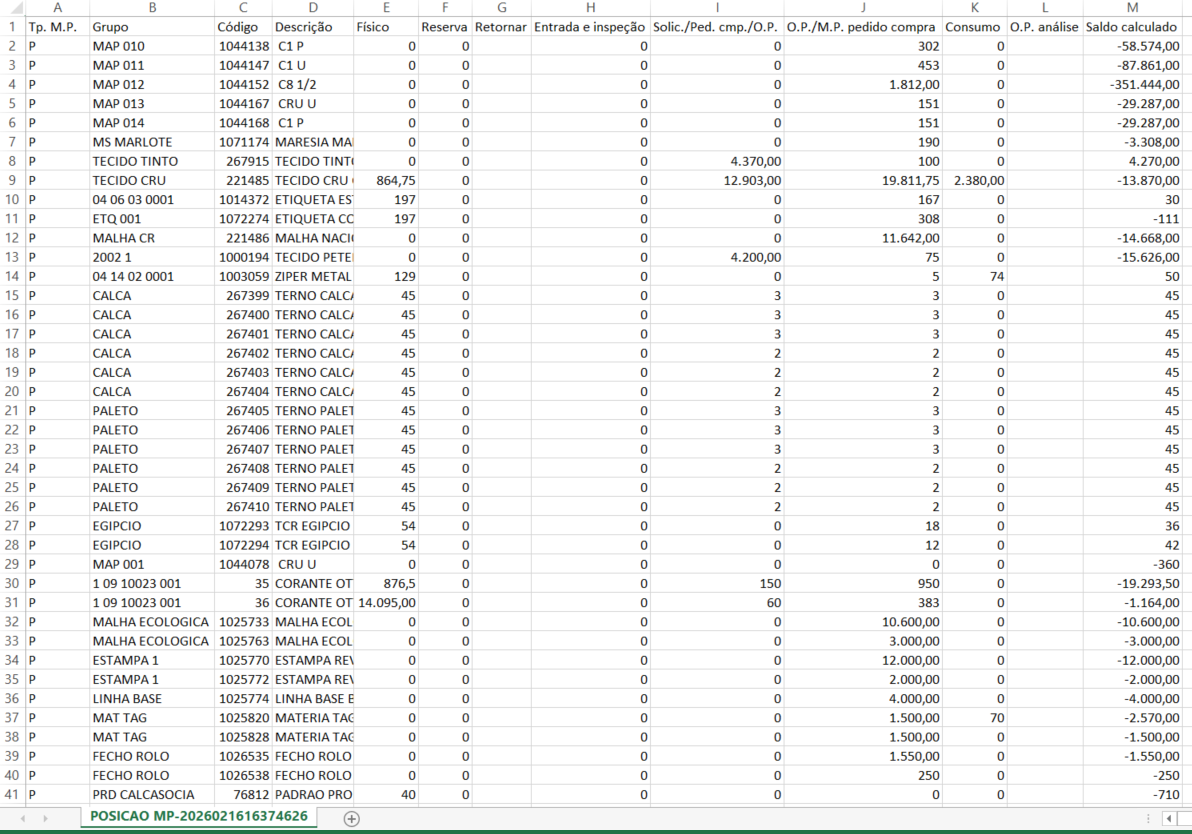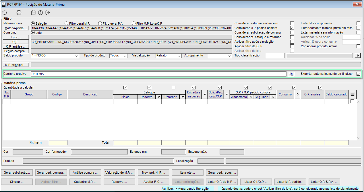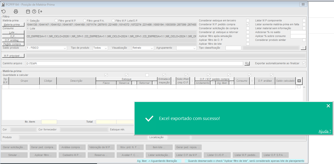 Atualmente, no componente PCPFP164 - Posição de Matéria-Prima o cálculo da posição de matéria-prima gera diversas colunas de resultado. Como esse processamento pode demandar um tempo elevado para conclusão e em situações de queda de sessão, interrupção do sistema ou perda de conexão, o usuário acaba perdendo todo o resultado gerado, sendo necessário reiniciar o processo.