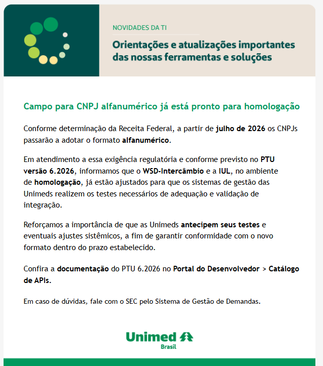 Conforme determinação da Receita Federal, a partir de julho de 2026 os CNPJs passarão a adotar o formato alfanumérico. Com isso, é necessário realizar a atualização do sistema para que seja possível consultar prestadores que possuem CNPJ alfanumérico, bem como receber requisições.