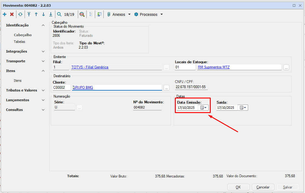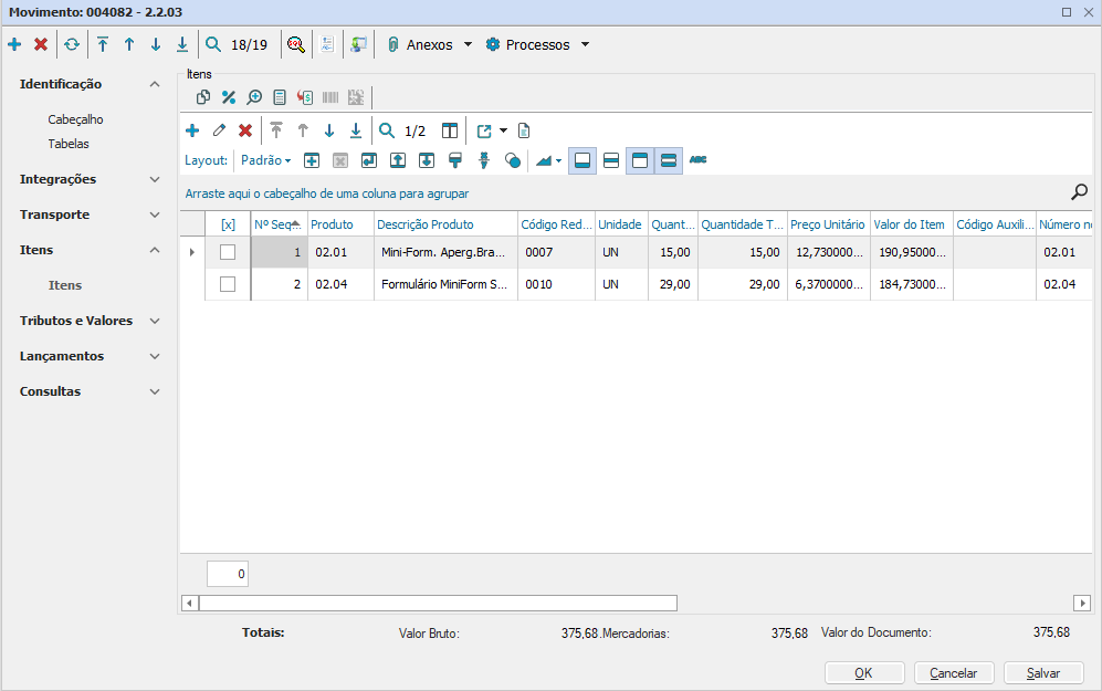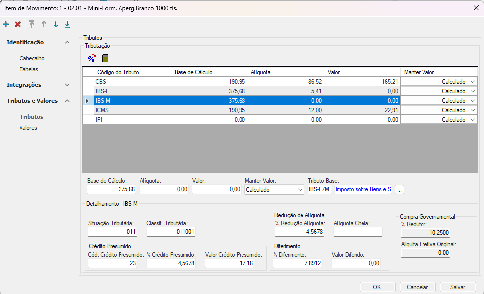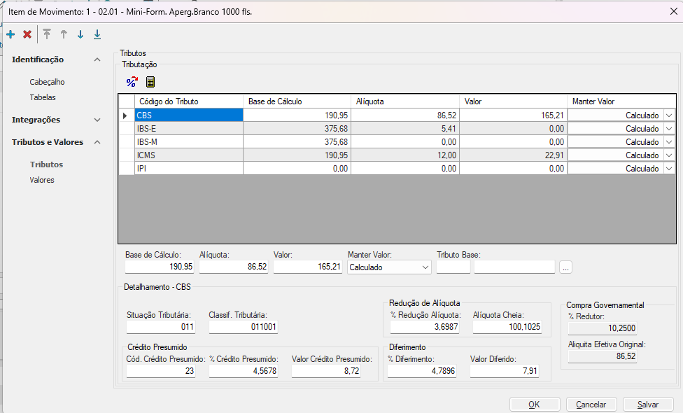 Tributos do item de movimento e retorno/aplicação do % de Redução para Compras Governamentais