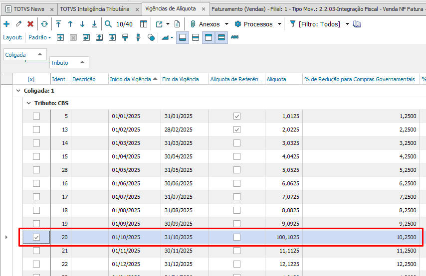 O percentual de redução de alíquota para compras governamentais é cadastrado junto à alíquota do tributo no cadastro de vigência e deve ser cadastrado apenas para o tributo CBS.