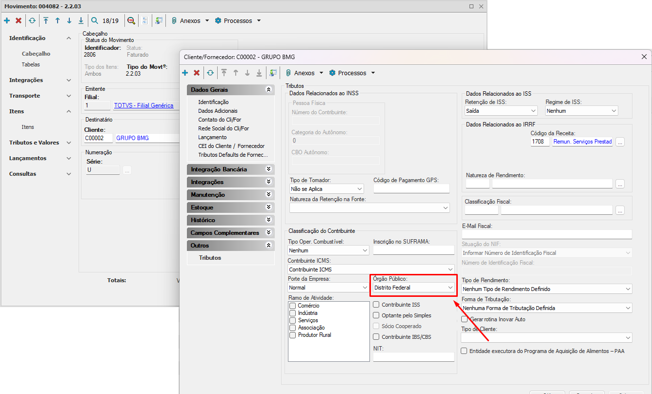 Perfil do Cliente: Verifica se o campo Órgão Público (localizado no cadastro de Cliente/Fornecedor > aba Outros | Tributos) está preenchido.