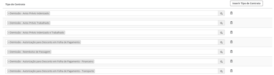 Ao clicar em "Inserir Tipo de Contrato", uma barra de pesquisa estará disponível, onde será possível selecionar os contratos necessários àquele grupo.