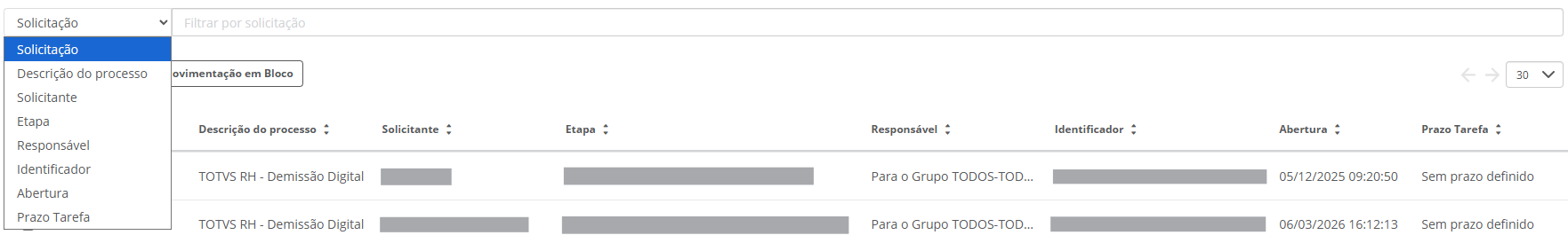 É possível encontrar a solicitação pelos dados de qualquer uma das colunas exibidas, ou seja, pelo número, descrição, solicitante, localização, responsável, identificador, data de abertura e prazo de conclusão.